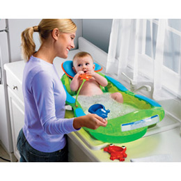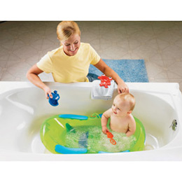 A bright, colorful, animal-filled bathing center designed for baby and you, that grows with your child from newborn to toddler. It’s designed with a special feature – a cushiony sling – that adjusts to support newborns and infants, and then removes for toddlers. For your newborn, use the cradle-sling position with head support for extra stability. Then, easily convert it to the reclined support position for older infants. Remove the sling when your toddler is ready to sit up in the tub. Soft arm cushions provide comfort while you’re helping baby take a bath. A drain plug helps make emptying and cleaning the tub easy.